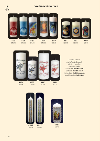 Von Hand beschrieben und von Hand bemalt mit kleinen Goldelementen. Jede Kerze ist ein Unikat.