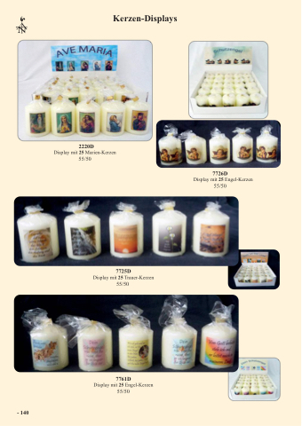 Kerzen-Displays 2220D Display mit 25 Marien-Kerzen 55/50 7726D Display mit 25 Engel-Kerzen 55/50 7725D Display mit 25 Trauer-Kerzen 55/50 - 140 N‰here Beschreibung siehe Preisliste. 7761D Display mit 25 Engel-Kerzen 55/50