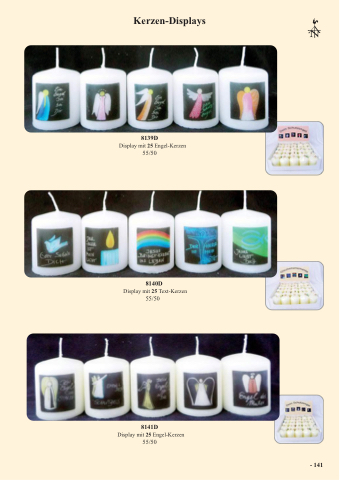 Kerzen-Displays 8139D Display mit 25 Engel-Kerzen 55/50 8140D Display mit 25 Text-Kerzen 55/50 N‰here Beschreibung siehe Preisliste. - 141 8141D Display mit 25 Engel-Kerzen 55/50