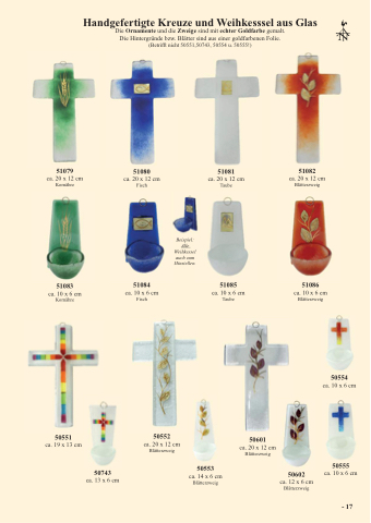 Handgefertigte Kreuze und Weihkesssel aus Glas Die Ornamente und die Zweige sind mit echter Goldfarbe gemalt.