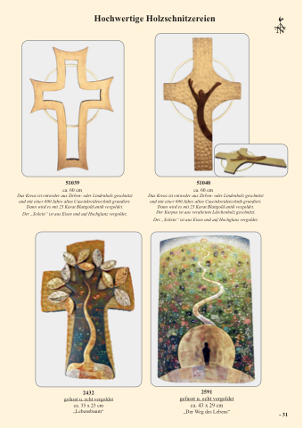 Das Kreuz ist entweder aus Zirben- oder Lindenholz geschnitzt und mit einer 600 Jahre alten Caseinkreidetechnik grundiert. Dann wird es mit 23 Karat Blattgold antik vergoldet.