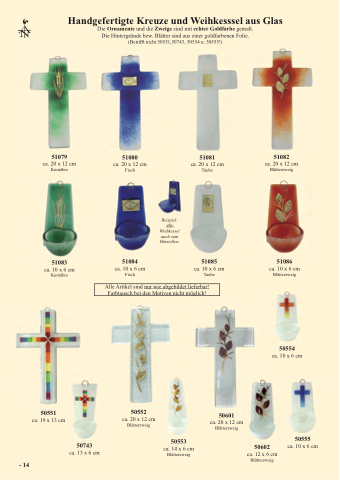 Handgefertigte Kreuze und Weihkesssel aus Glas Die Ornamente und die Zweige sind mit echter Goldfarbe gemalt.