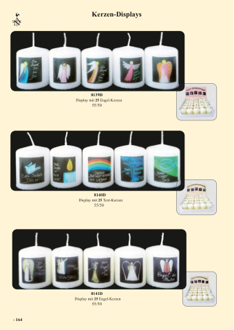 Kerzen-Displays 8139D Display mit 25 Engel-Kerzen 55/50 8140D Display mit 25 Text-Kerzen 55/50 - 164 Nähere Beschreibung siehe Preisliste. 8141D Display mit 25 Engel-Kerzen 55/50