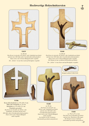 Das Kreuz ist entweder aus Zirben- oder Lindenholz geschnitzt und mit einer 600 Jahre alten Caseinkreidetechnik grundiert. Dann wird es mit 23 Karat Blattgold antik vergoldet.