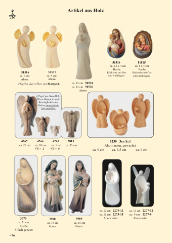 4 Engel aus Soar-Holz. Diese können je nach Beschaffenheit des Holzes unterschied- lich ausfallen.